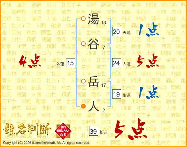 湯谷岳人さんの総運は39画の5点!