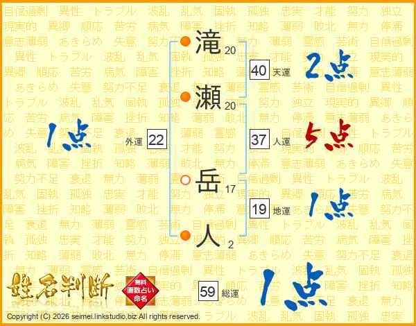 滝(20画)瀬(20画) 岳(17画)人(2画)