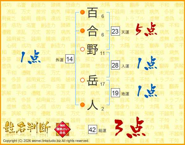百(6画)合(6画)野(11画) 岳(17画)人(2画)