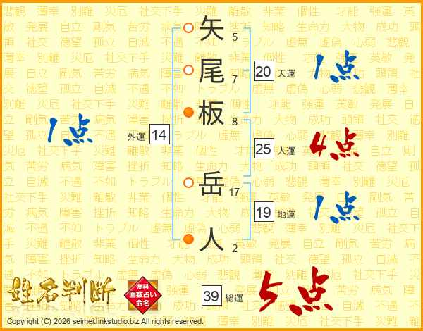 矢(5画)尾(7画)板(8画) 岳(17画)人(2画)