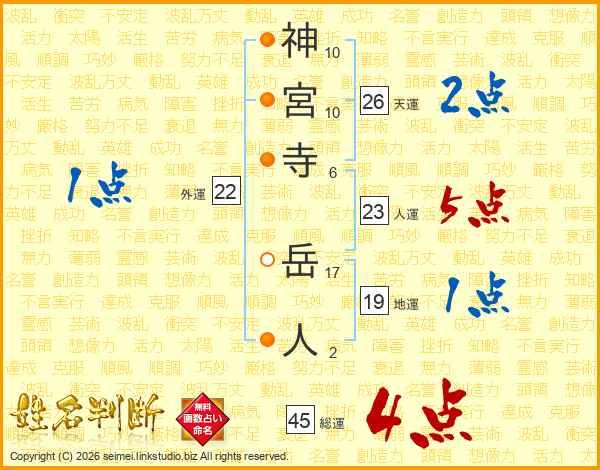 神(10画)宮(10画)寺(6画) 岳(17画)人(2画)