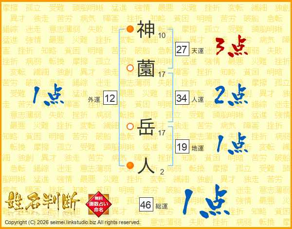 生活面を象徴する運勢です。外部から受ける影響力を表し、結婚運、家庭運や職場、環境への順応性を表します。総運から人運を引いた画数。姓や名が1文字の場合を除く。