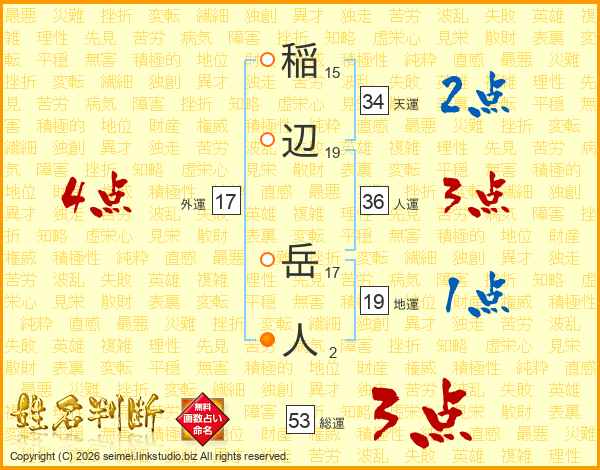 稲(15画)辺(19画) 岳(17画)人(2画)