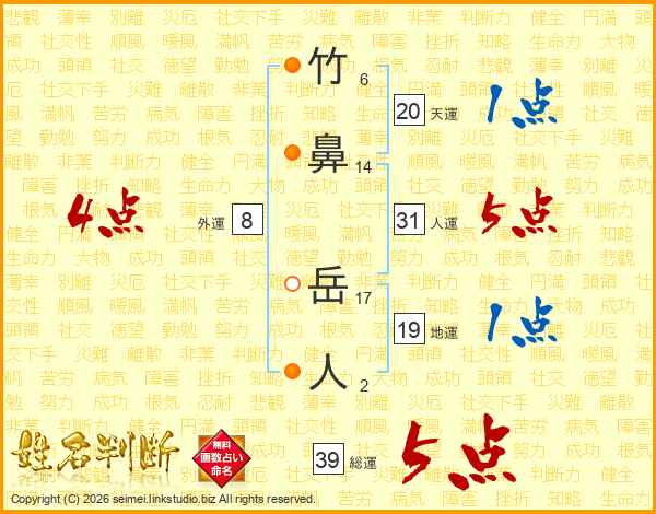 竹鼻岳人さんの総運は39画の5点!