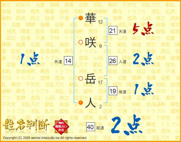 華咲岳人さんの天運は21画の5点!