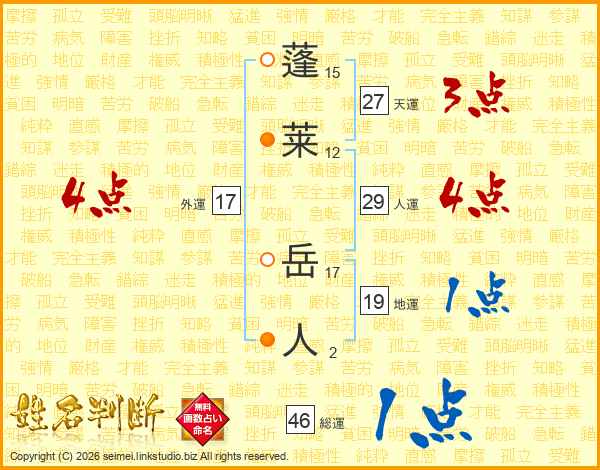 蓬(15画)莱(12画) 岳(17画)人(2画)