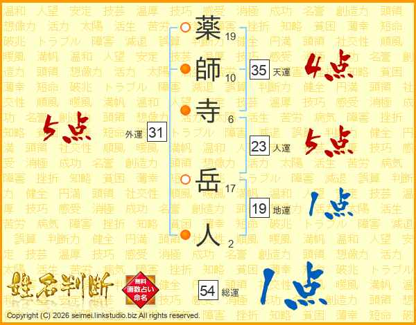 薬(19画)師(10画)寺(6画) 岳(17画)人(2画)