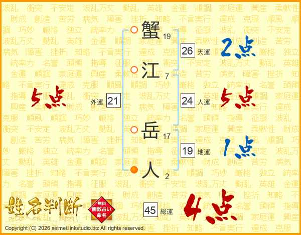蟹(19画)江(7画) 岳(17画)人(2画)