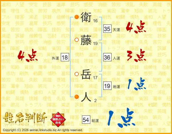 衛(16画)藤(19画) 岳(17画)人(2画)