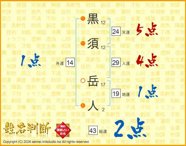 あなたの人生を表す1番重要な運勢です。生涯を通じて影響する総合運となり、主に50歳以降の晩年期に影響を及ぼします。苗字と名前の合計画数。