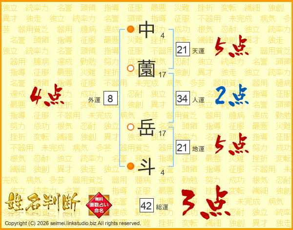 中(4画)薗(17画) 岳(17画)斗(4画)