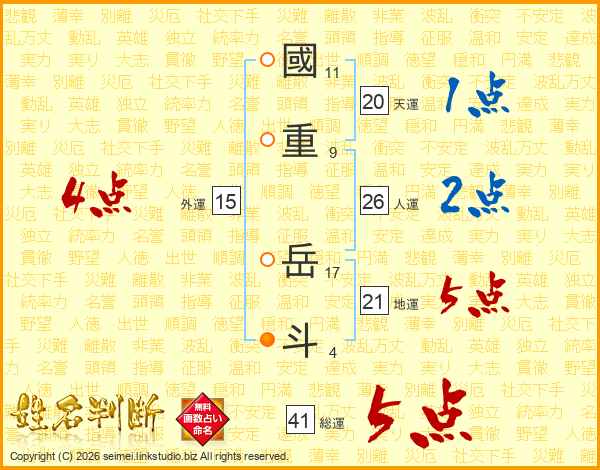 あなたの人生を表す1番重要な運勢です。生涯を通じて影響する総合運となり、主に50歳以降の晩年期に影響を及ぼします。苗字と名前の合計画数。