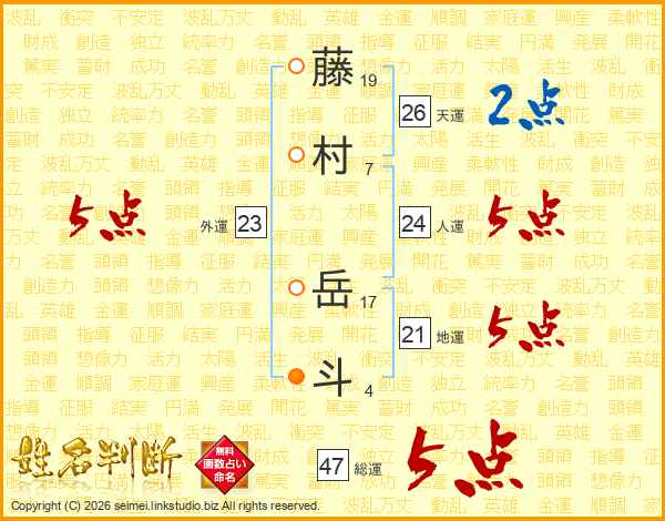 藤村岳斗さんの総運は47画の5点!