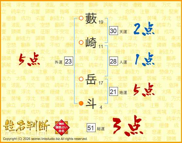 藪崎岳斗さんの総運は51画の3点!