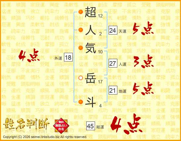 超(12画)人(2画)気(10画) 岳(17画)斗(4画)