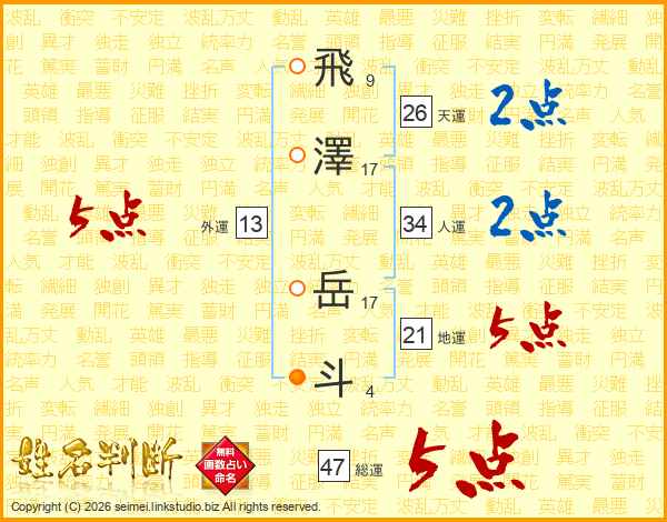 飛澤岳斗さんの総運は47画の5点!