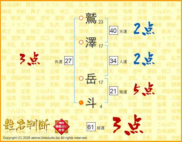 鷲澤岳斗さんの総運は61画の3点!