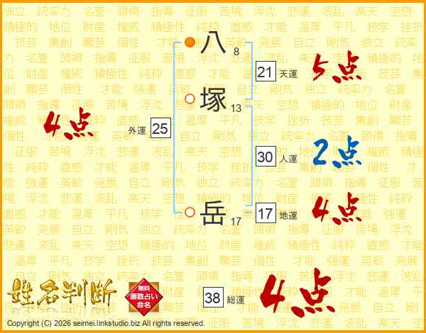 生活面を象徴する運勢です。外部から受ける影響力を表し、結婚運、家庭運や職場、環境への順応性を表します。総運から人運を引いた画数。姓や名が1文字の場合を除く。