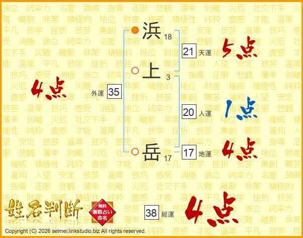 浜上岳さんの総運は38画の4点!