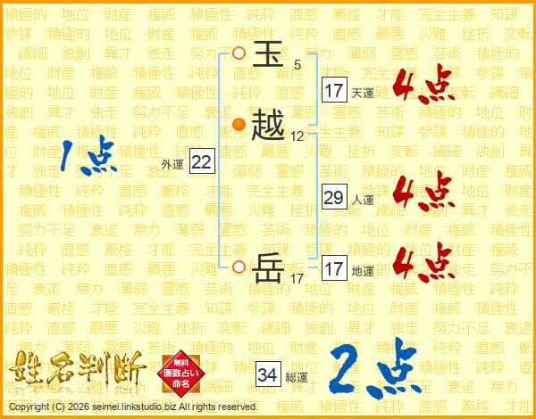 あなたの人生を表す1番重要な運勢です。生涯を通じて影響する総合運となり、主に50歳以降の晩年期に影響を及ぼします。苗字と名前の合計画数。