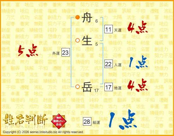 生活面を象徴する運勢です。外部から受ける影響力を表し、結婚運、家庭運や職場、環境への順応性を表します。総運から人運を引いた画数。姓や名が1文字の場合を除く。
