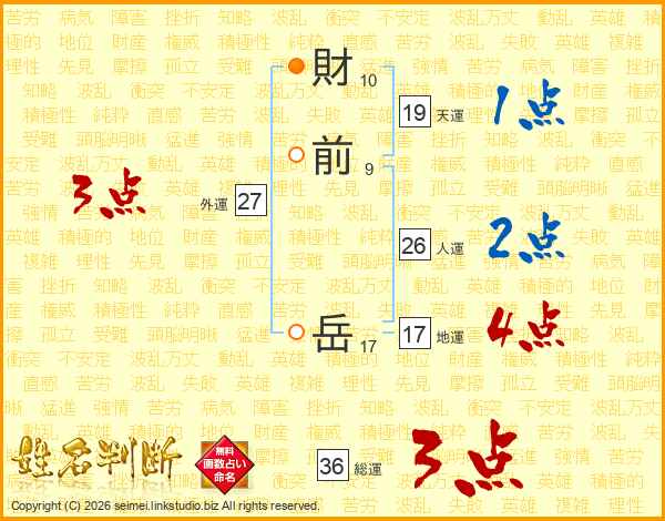 生活面を象徴する運勢です。外部から受ける影響力を表し、結婚運、家庭運や職場、環境への順応性を表します。総運から人運を引いた画数。姓や名が1文字の場合を除く。