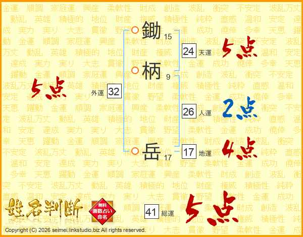 鋤柄岳さんの総運は41画の5点!