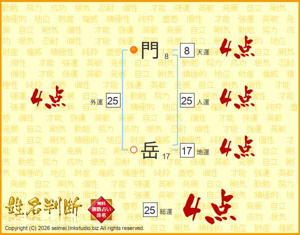 生活面を象徴する運勢です。外部から受ける影響力を表し、結婚運、家庭運や職場、環境への順応性を表します。総運から人運を引いた画数。姓や名が1文字の場合を除く。