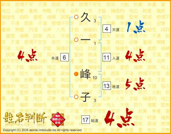 生活面を象徴する運勢です。外部から受ける影響力を表し、結婚運、家庭運や職場、環境への順応性を表します。総運から人運を引いた画数。姓や名が1文字の場合を除く。