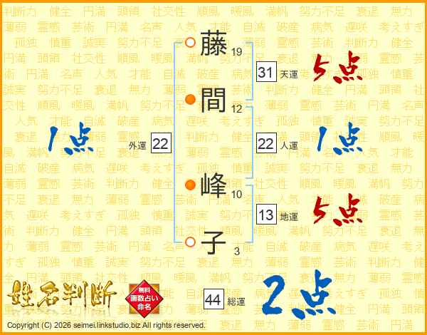 あなたの人生を表す1番重要な運勢です。生涯を通じて影響する総合運となり、主に50歳以降の晩年期に影響を及ぼします。苗字と名前の合計画数。