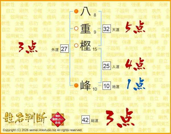 生活面を象徴する運勢です。外部から受ける影響力を表し、結婚運、家庭運や職場、環境への順応性を表します。総運から人運を引いた画数。姓や名が1文字の場合を除く。