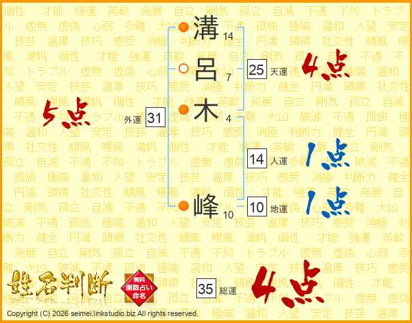 生活面を象徴する運勢です。外部から受ける影響力を表し、結婚運、家庭運や職場、環境への順応性を表します。総運から人運を引いた画数。姓や名が1文字の場合を除く。