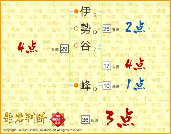 伊(6画)勢(13画)谷(7画) 峰(10画)