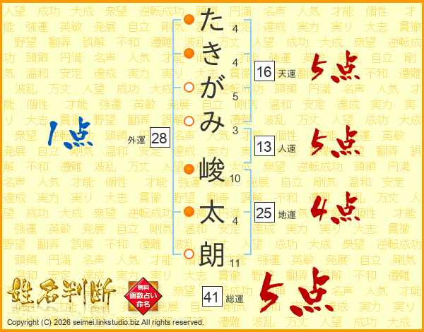 た(4画)き(4画)が(5画)み(3画) 峻(10画)太(4画)朗(11画)