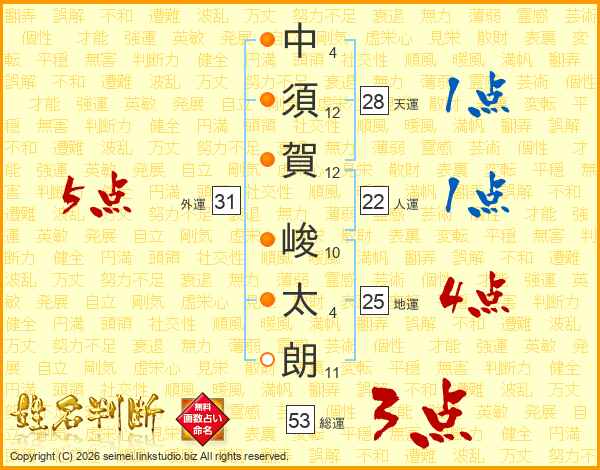 中(4画)須(12画)賀(12画) 峻(10画)太(4画)朗(11画)