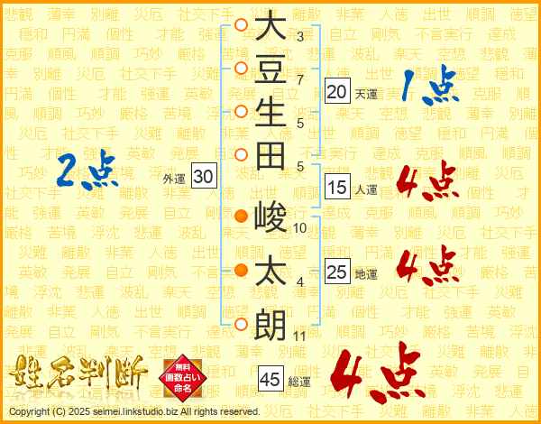 大(3画)豆(7画)生(5画)田(5画) 峻(10画)太(4画)朗(11画)