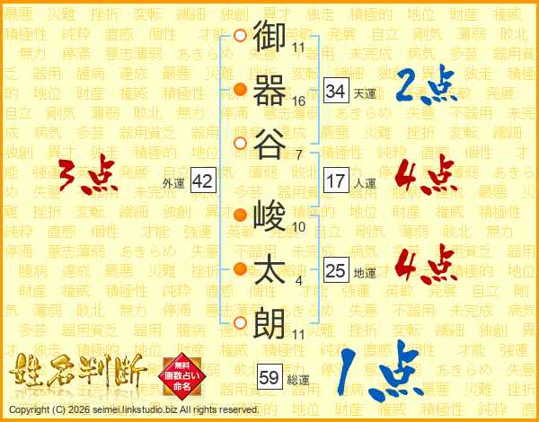 御(11画)器(16画)谷(7画) 峻(10画)太(4画)朗(11画)