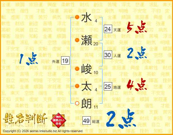 水(4画)瀬(20画) 峻(10画)太(4画)朗(11画)