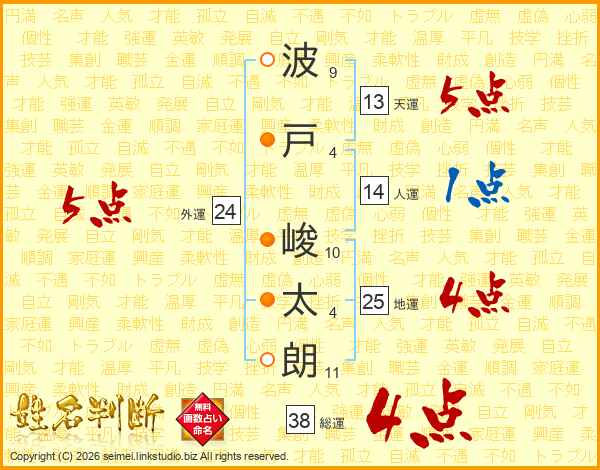 波(9画)戸(4画) 峻(10画)太(4画)朗(11画)