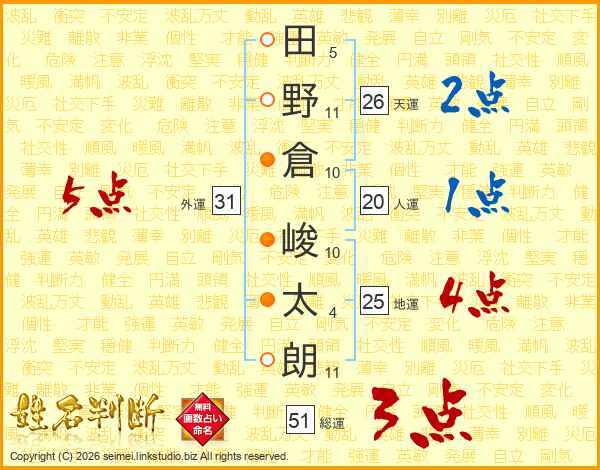 田(5画)野(11画)倉(10画) 峻(10画)太(4画)朗(11画)