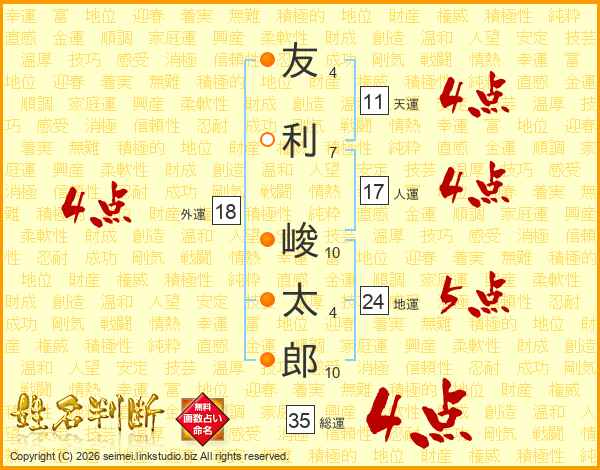 友(4画)利(7画) 峻(10画)太(4画)郎(10画)
