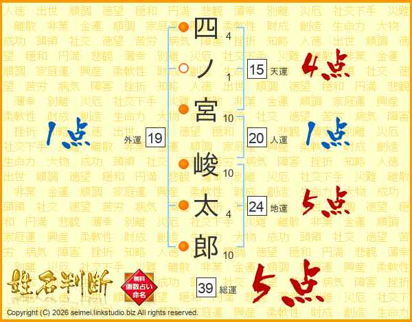 四(4画)ノ(1画)宮(10画) 峻(10画)太(4画)郎(10画)