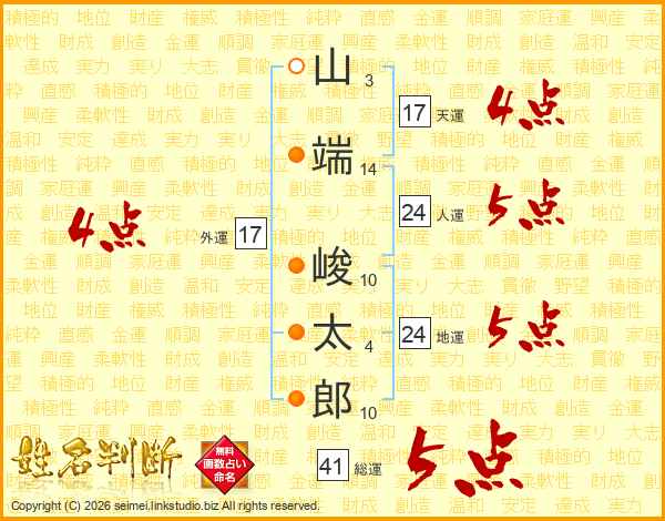 山(3画)端(14画) 峻(10画)太(4画)郎(10画)