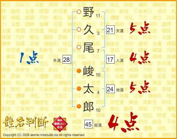 野久尾峻太郎さんの総運は45画の4点!