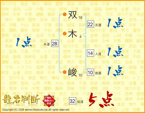 生活面を象徴する運勢です。外部から受ける影響力を表し、結婚運、家庭運や職場、環境への順応性を表します。総運から人運を引いた画数。姓や名が1文字の場合を除く。