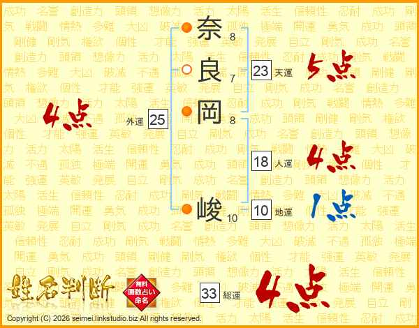奈(8画)良(7画)岡(8画) 峻(10画)