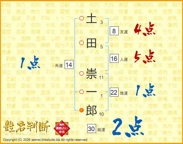 土(3画)田(5画) 崇(11画)一(1画)郎(10画)