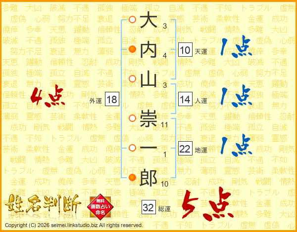 大(3画)内(4画)山(3画) 崇(11画)一(1画)郎(10画)