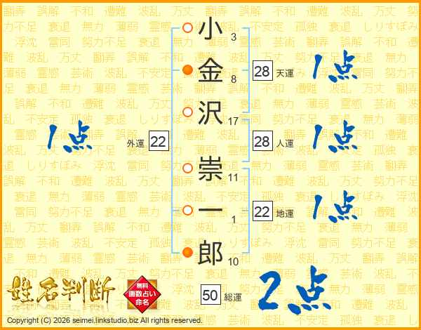 小(3画)金(8画)沢(17画) 崇(11画)一(1画)郎(10画)