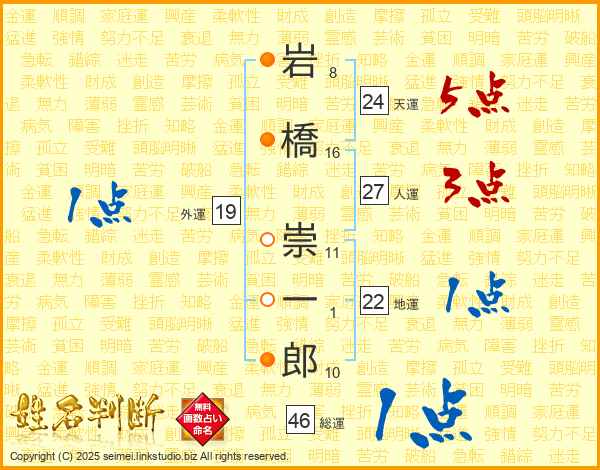 岩(8画)橋(16画) 崇(11画)一(1画)郎(10画)